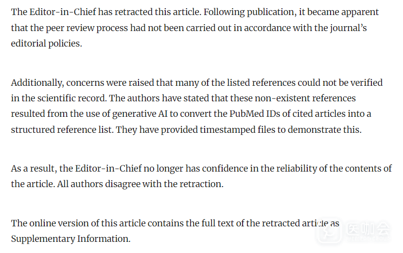 期刊最终于11月29日撤稿。撤稿声明指出:作者表示,这些不存在的参考文献是由于使用生成式AI将引用文章的PubMed ID转换为结构化参考文献列表导致的。因此,期刊不再对文章内容的可靠性抱有信心。