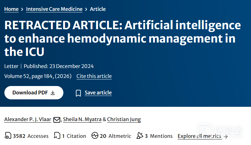 《Intensive Care Medicine》是欧洲重症监护医学会的期刊,由施普林格·自然出版。2025年11月4日,出版商在该文章下添加了一则编辑说明,指出“有人提出文中存在虚假引文的问题”。