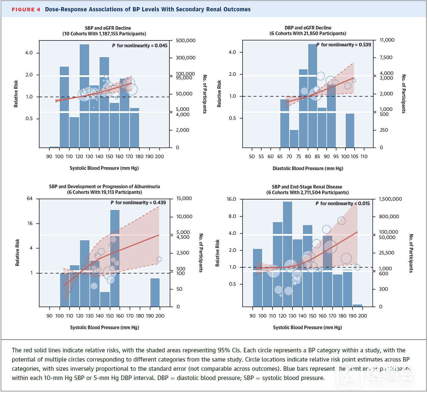 所有次要肾脏结局与血压水平呈线性正相关或单调递增趋势。