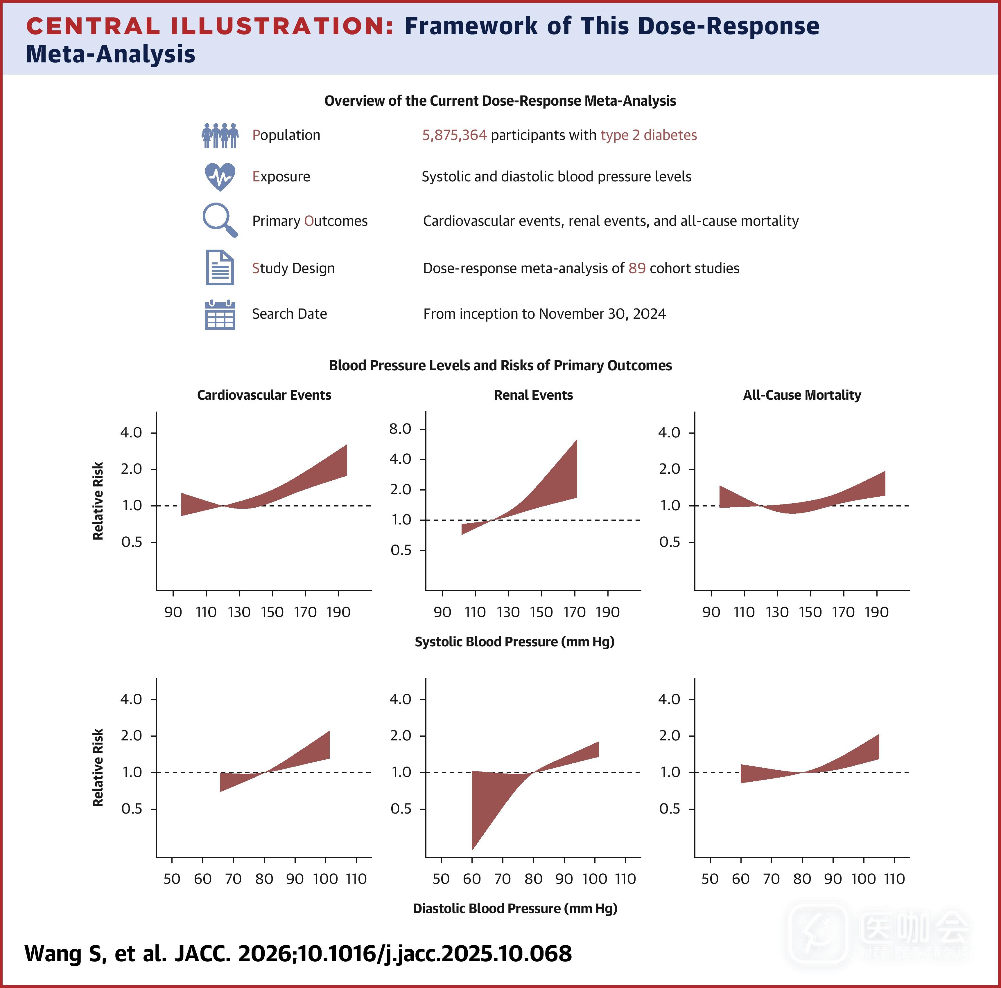 2026年1月21日,JACC在线发表了上海交通大学医学院附属瑞金医院宁光院士、王卫庆教授、毕宇芳教授和徐瑜教授团队领导的一项剂量反应Meta分析成果。该Meta分析评估了2型糖尿病患者的收缩压和舒张压水平与全因死亡率、心血管及肾脏结局之间的剂量反应关系。