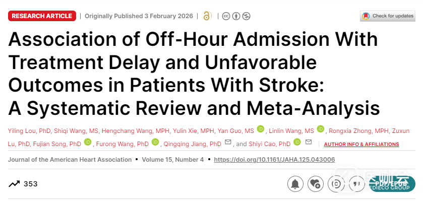 2026年2月3日,华中科技大学同济医学院的曹世义教授团队在《Journal of the American Heart Association》发表了一篇系统综述和Meta分析,评估了非工作时间入院卒中患者的治疗和预后情况。研究发现:在周末或夜间入院的卒中患者治疗启动时间显著延长,且非工作时间入院与短期死亡风险升高相关。