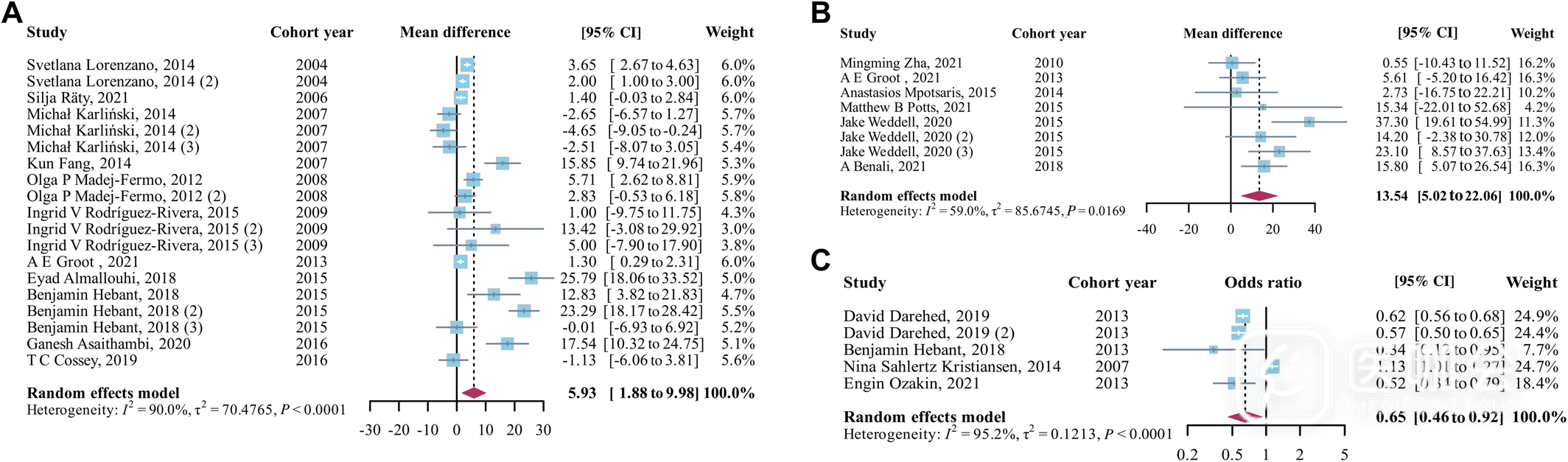 采用I²统计量评估研究异质性。通过Q统计量、τ统计量及95%预测区间综合判断异质性水平,其中τ值为研究间真实效应标准差的估计值,用于计算任意两项研究间效应量的最大预期差异,预测区间则用于评估未来研究的预期效应范围。