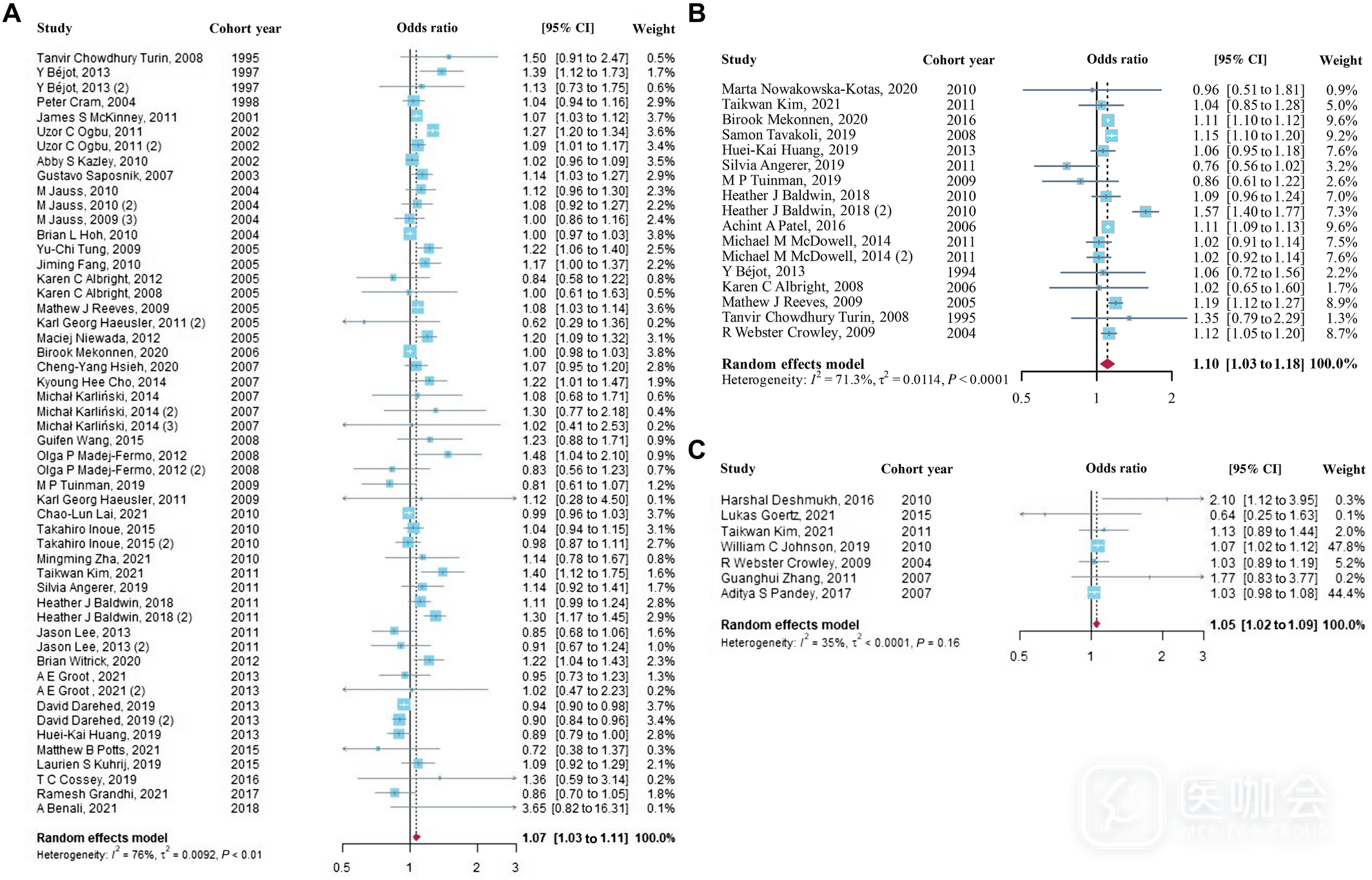 - 40项研究报告缺血性卒中短期死亡风险,非工作时间入院患者短期死亡风险更高:OR 1.07(95%CI 1.03–1.11);I²=76%;τ=0.10;预测区间0.91–1.25;