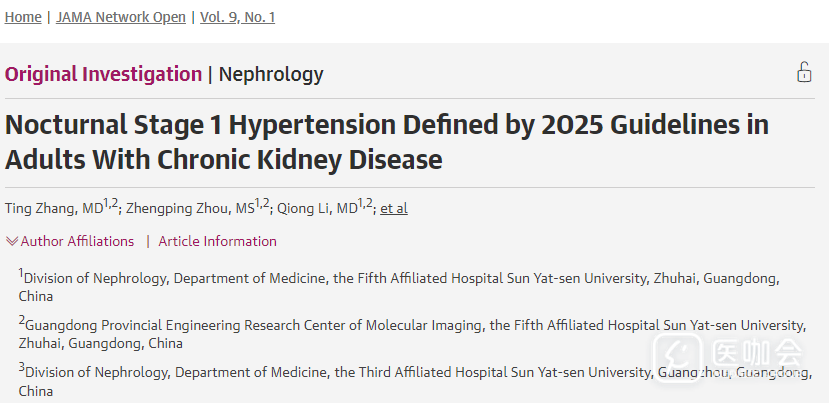 2026年1月,中山大学第五附属医院肾病科研究团队在《JAMA Network Open》发表了一项回顾性队列研究[1],就2025美国心脏病学会/美国心脏协会(ACC/AHA)指南定义的夜间1级高血压,是否与慢性肾病(CKD)进展存在关联进行了探讨。研究发现:在中国未接受透析的成年CKD患者中,与夜间非高血压相比,2025 ACC/AHA指南定义的夜间1级高血压与CKD进展风险增加独立相关。