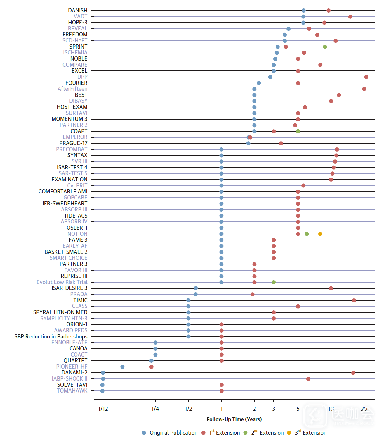 检索MEDLINE数据库中,2019年1月1日至2023年10月24日发表于7种高分期刊(NEJM、Lancet、JAMA、Circulation、EHJ、JACC和JAMA Cardiology)的文献,筛选出所有延长随访期的心血管随机对照试验。
