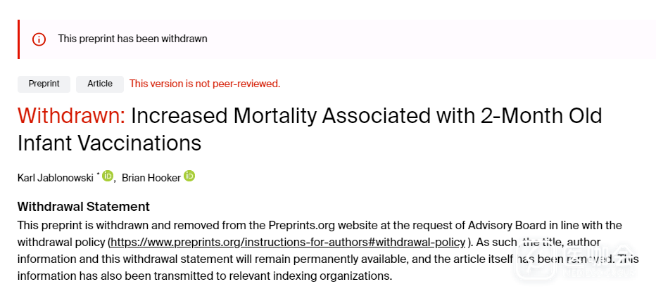 2026年1月,一篇预印本研究被平台撤稿,这篇文章指出:与未接种者相比,出生后第二个月接种疫苗的儿童,短期死亡风险增加。遭到撤稿后,作者立即又将论文发布到另外一个平台。
