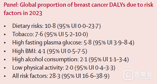 GBD 2023中,运用比较风险评估框架,评估了导致乳腺癌负担的七种三级风险因素::高红肉饮食、二手烟、高空腹血糖、高BMI(成人)、过量饮酒、低体力活动、吸烟。
