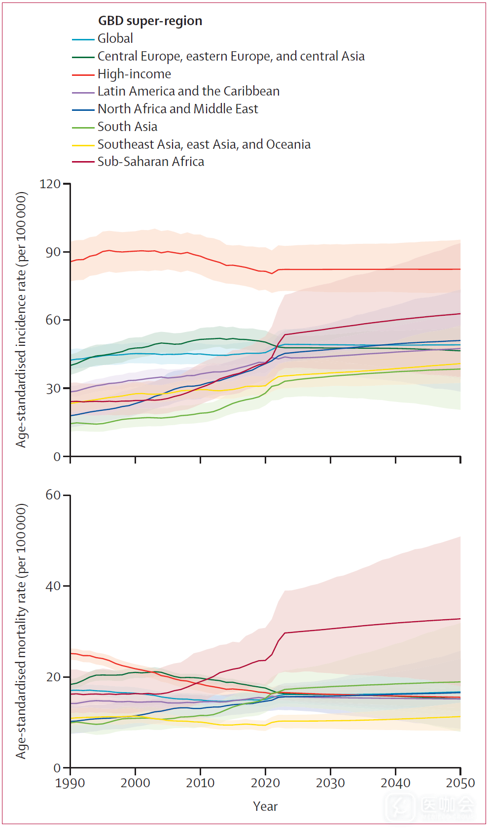 图.1990-2023年全球女性乳腺癌ASIR(上)和ASMR(下)