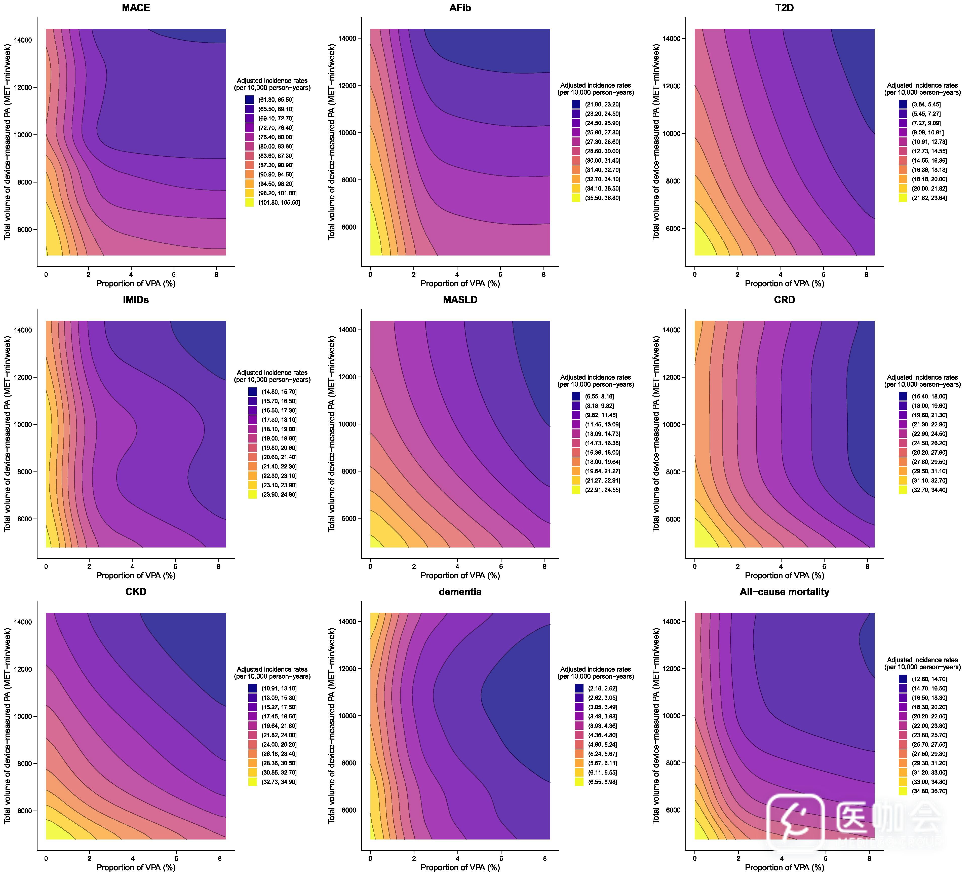 对于MACE、房颤、T2D、MASLD、CKD和全因死亡率,等值线呈现对角线分布模式,表明随着总体活动量和高强度活动占比的同时增加,疾病风险持续降低。而对于IMIDs、慢性呼吸系统疾病和痴呆症,等值线主要为垂直分布,表明风险降低主要与更高的高强度活动占比相关,单纯增加总体活动量的益处有限。