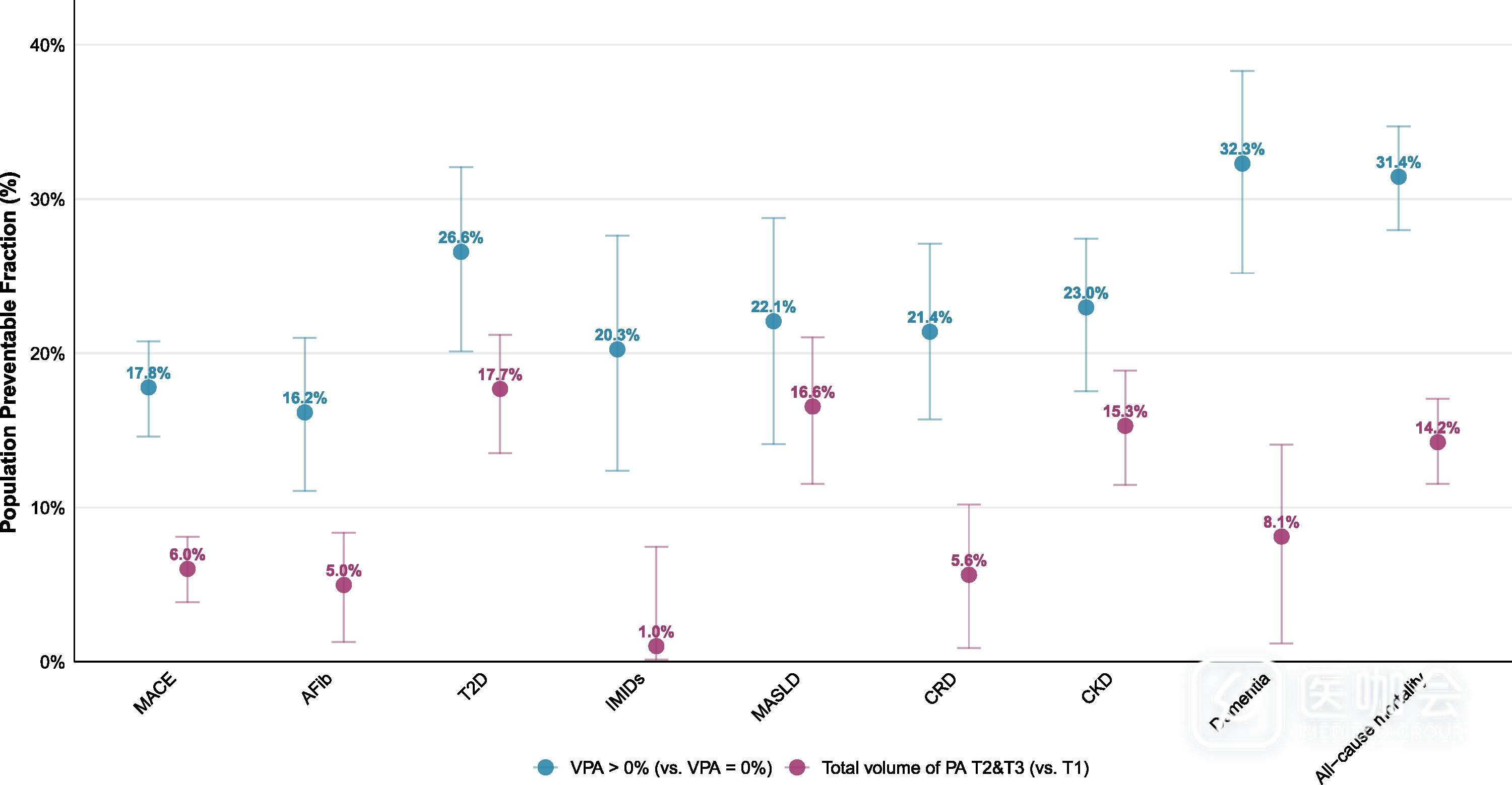MACE(17.8% vs. 6.0%)、房颤(16.2% vs. 5.0%)、慢性呼吸系统疾病(21.4% vs. 5.6%)和痴呆症(32.3% vs. 8.1%)的预防中,高强度活动起到主要作用,总体活动量的作用稍小。