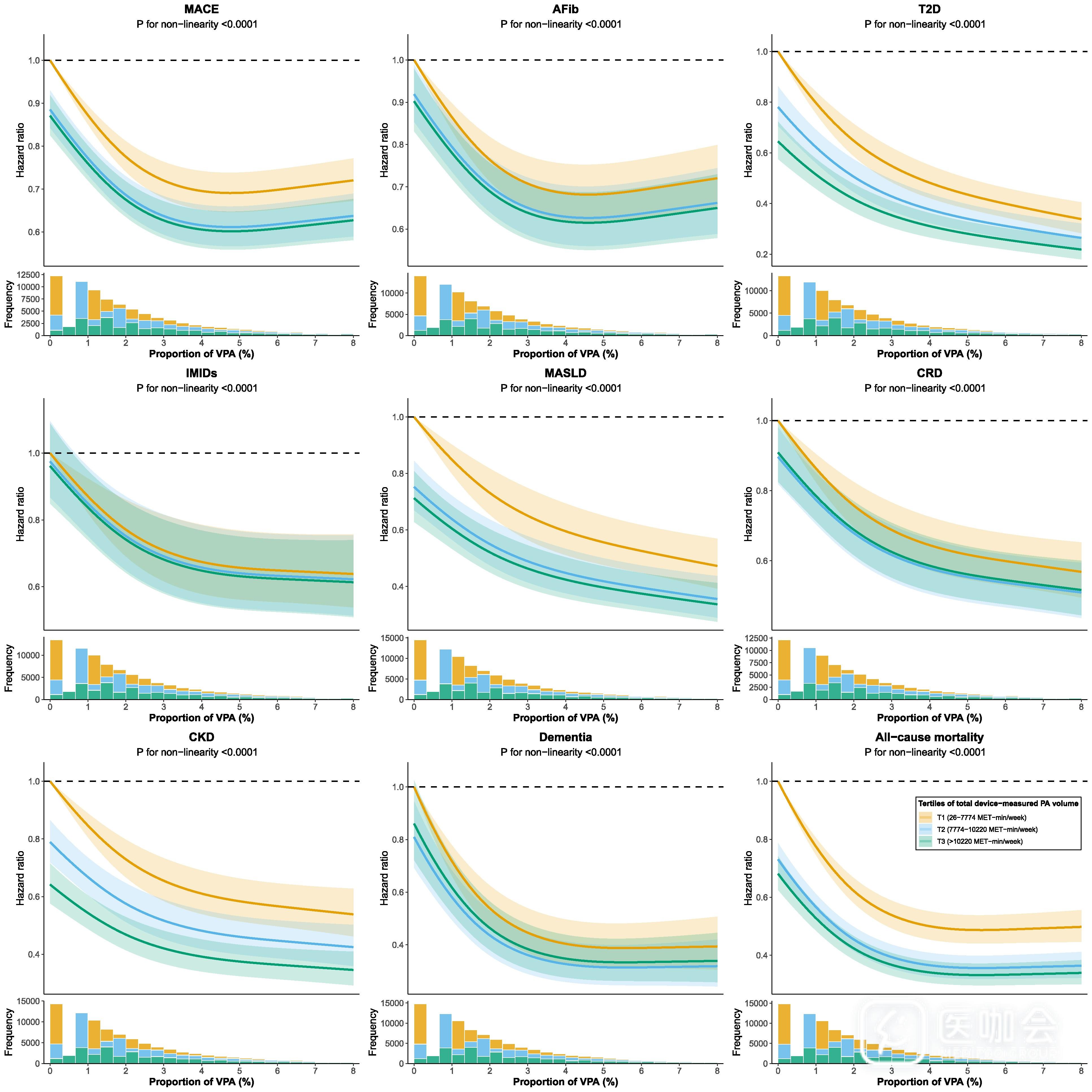 设备测量数据分析显示,总体活动量的三分位数组中,高强度活动占比与健康结局均存在显著的非线性关联(所有非线性P值<0.001)。