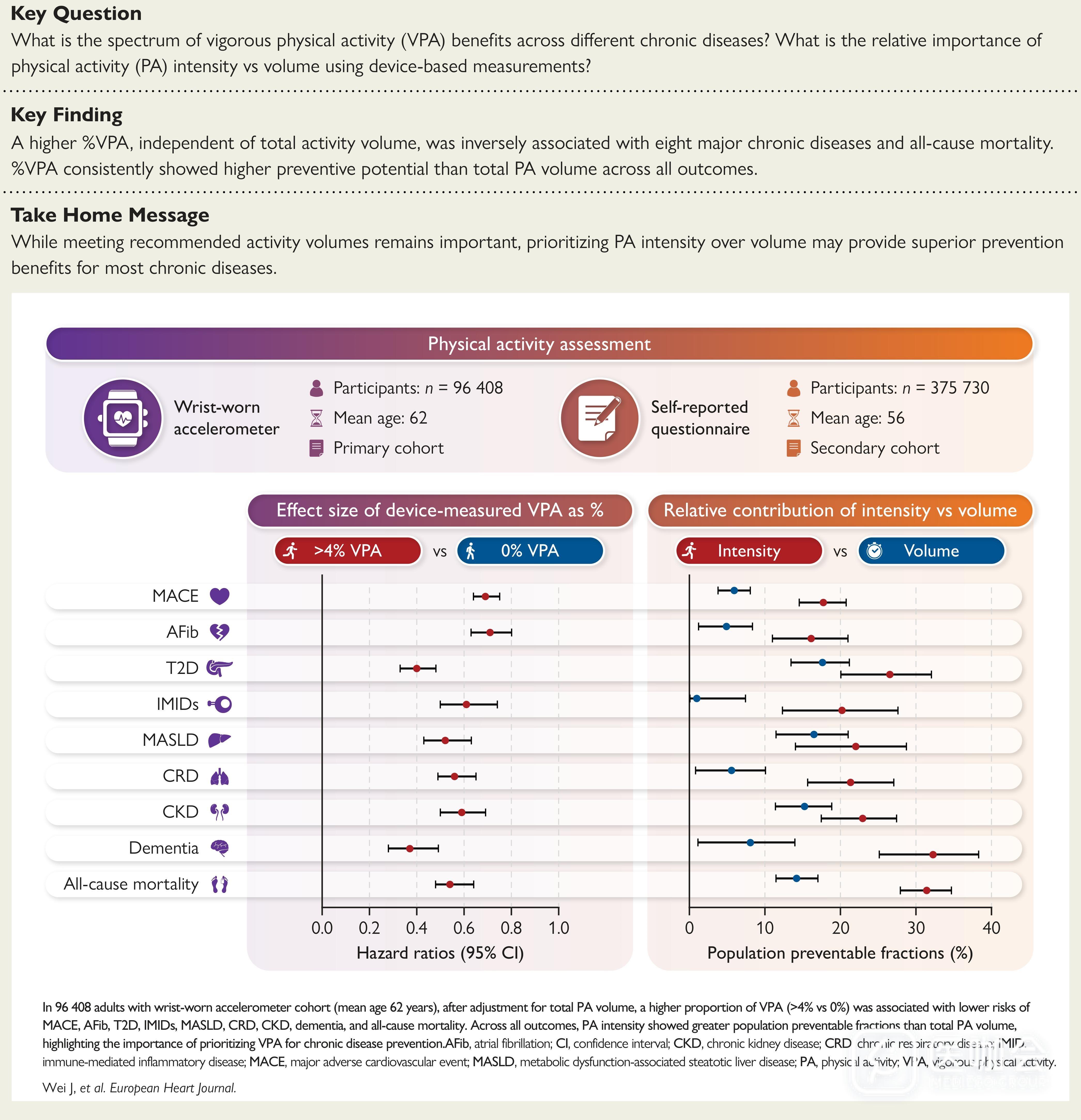 2026年3月29日,EHJ发表了一篇文章,使用英国生物银行(UKB)探讨了高强度活动占总运动量的比例和总体活动量,与八种主要慢性病的关联。研究发现:高强度活动占比较大与八种主要慢性病及全因死亡率呈负相关,且该关联独立于总体活动量。活动强度显示出比总体活动量更高的预防潜力。