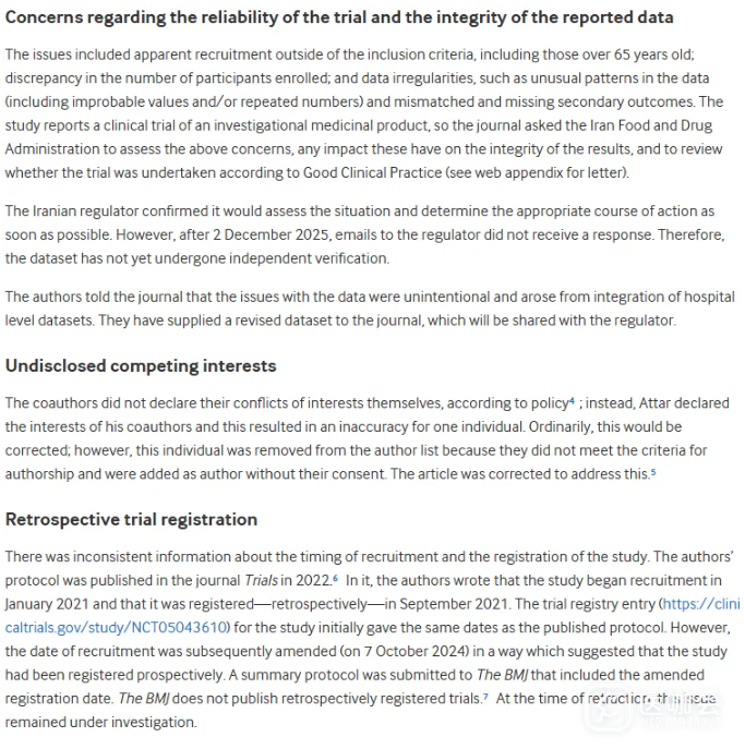 撤稿声明还指出该研究“招募时间和注册时间的信息不一致”。作者提交给BMJ的研究方案中表示,该试验是在患者入组前注册的。但既往发表的研究方案中,以及在 clinicaltrials.gov上的原始日期记录,都表明试验是在招募开始后才注册的。随后,该日期被修改了,“给人一种该研究是前瞻性注册的假象”。