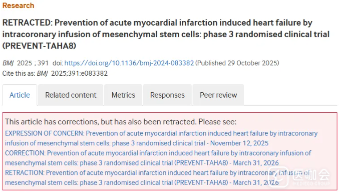 2026年3月31日,BMJ撤回了一篇关于干细胞疗法降低心衰风险的论文。该论文发表后不久,就有人指出论文存在严重的数据不一致问题。