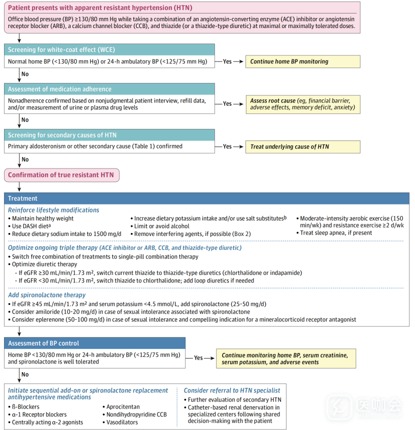 图. 难治性高血压管理路径。原文链接:https://jamanetwork.com/journals/jama/article-abstract/2846682