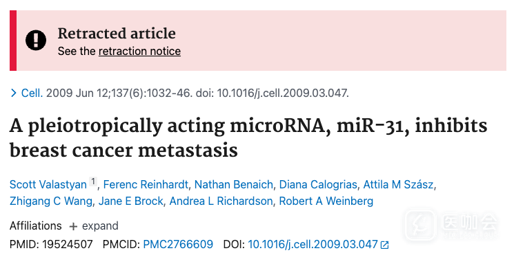 撤稿声明中提及了"早期发表成果的影响",也出现在另两篇论文的撤稿声明中。这两篇论文均发表在《Genes and Development》上[3],标题为“三个靶基因的协同抑制可解释微小RNA对转移的影响”和“在已形成的转移灶中激活 miR-31 的功能可诱导转移灶消退”,分别被引73次和54次。