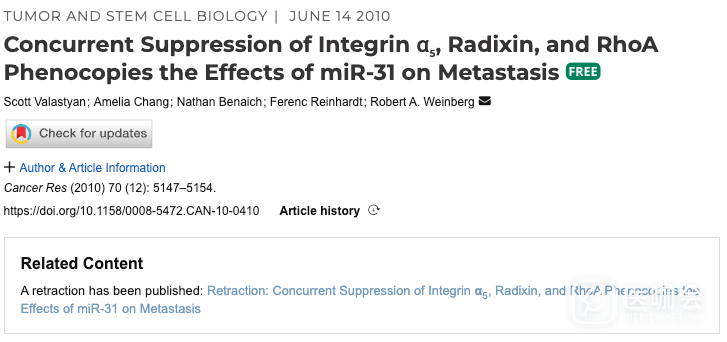 第五篇撤稿发生在2015年。这篇文章于2010年发表在《Cancer Research》上,标题为“同时抑制整合素α5、Radixin和RhoA可模拟miR-31对转移的影响”。