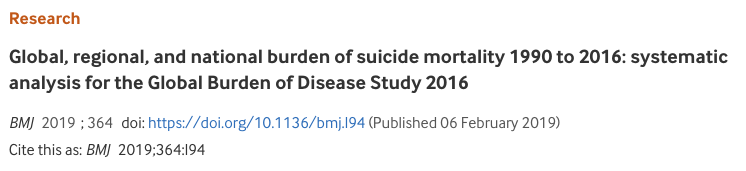 参考文献:Global, regional, and national burden of suicide mortality 1990 to 2016: systematic analysis for the Global Burden of Disease Study 2016.BMJ 2019;364:l94.