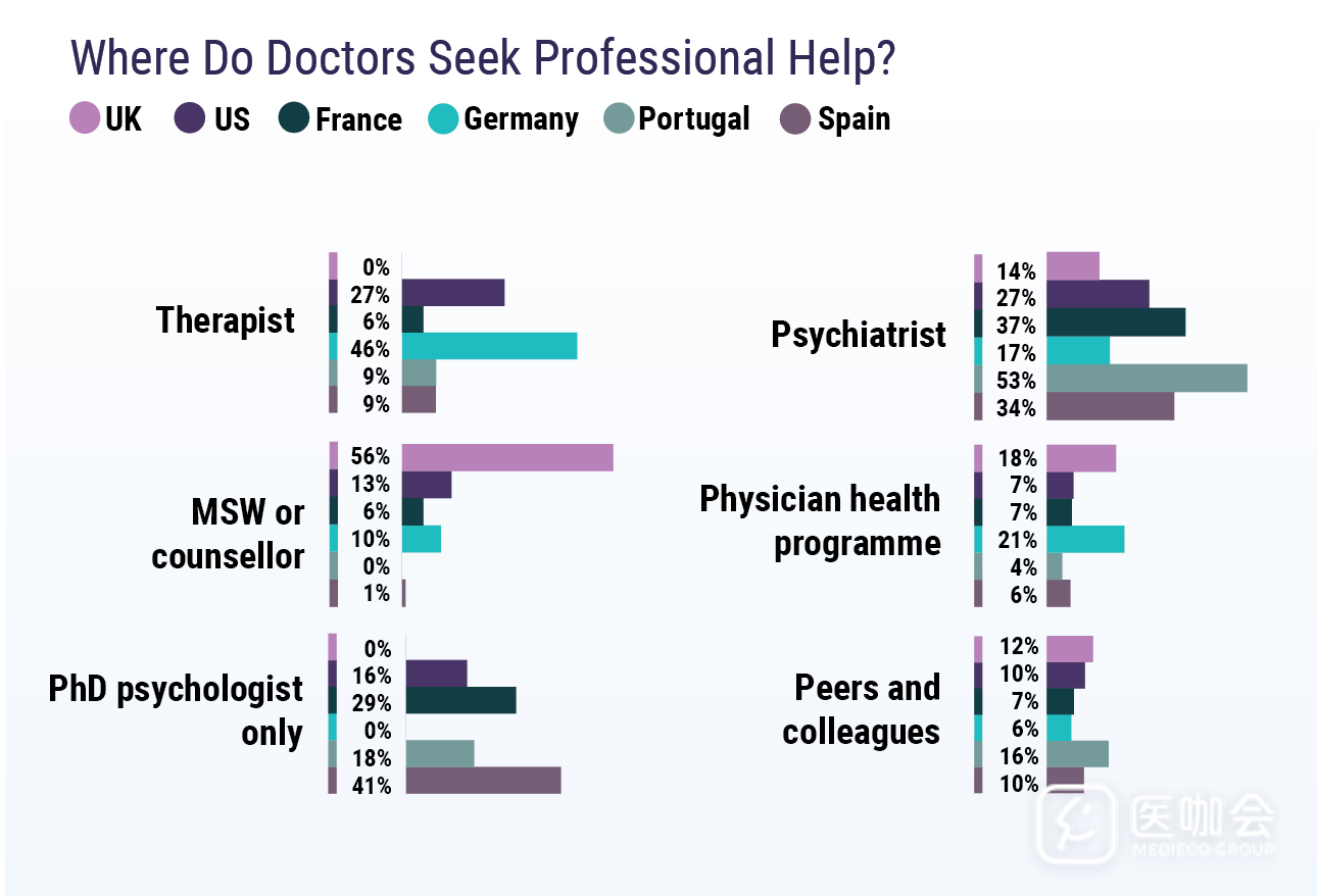 调查显示,职业倦怠/抑郁医生寻求帮助的对象多种多样,反映了心理健康的不同侧面。最受德国医生欢迎的是专业的治疗师,但英国医生很少去寻求专业治疗师的帮助。社会工作者(MSWs)或者顾问是英国医生最普遍的寻求帮助的对象,但葡萄牙或西班牙医生中几乎不会去寻求这种帮助。
