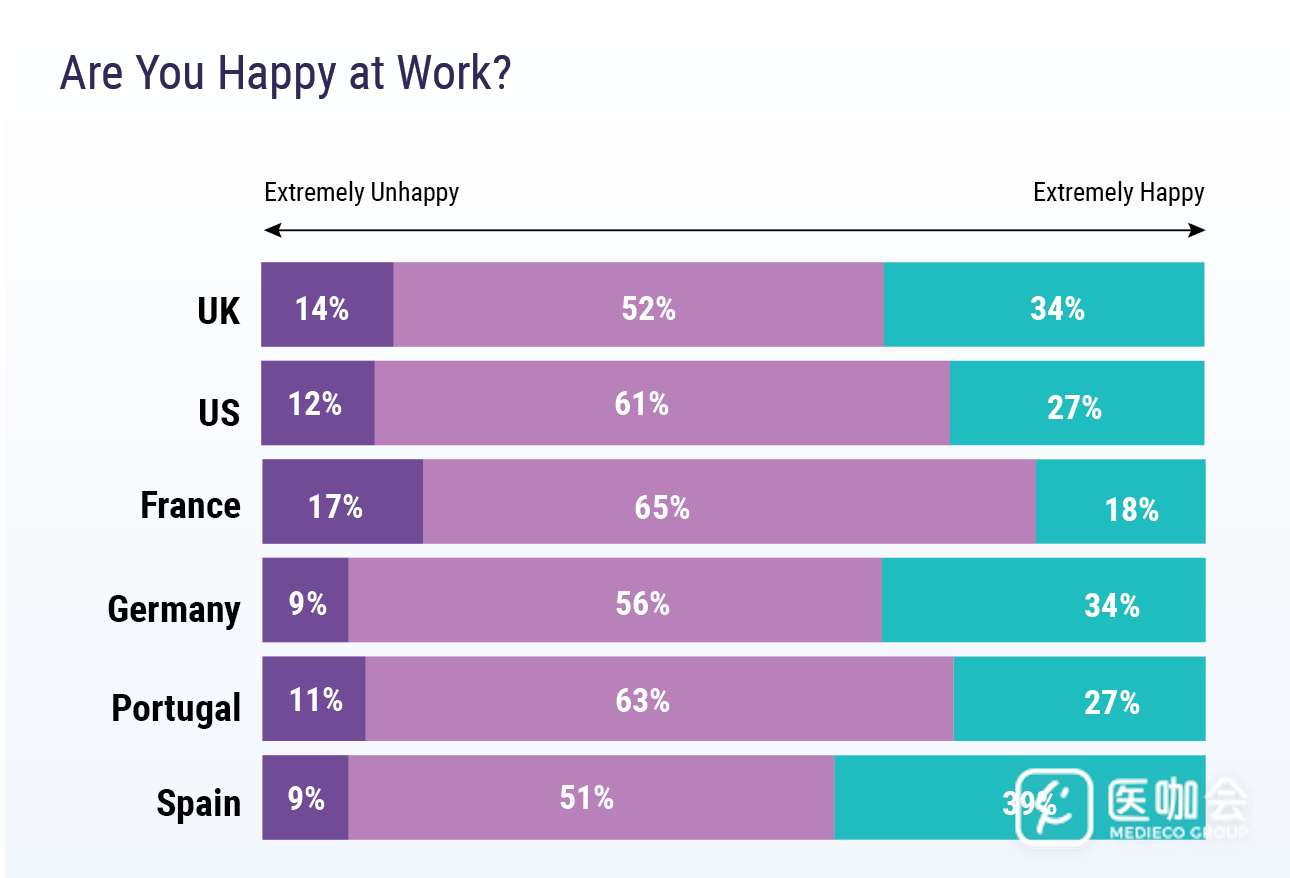 在所有国家中,18%—39%的医生在工作幸福感特别高,西班牙医生工作幸福感最高。然而,就像家庭生活一样,法国医生工作幸福感最低。