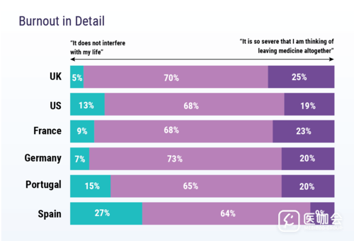 调查结果显示,在所有国家中,大部分存在职业倦怠和抑郁问题的医生都感觉是职业倦怠导致他们抑郁的。对于那些存在职业倦怠问题的医生,当被要求在很少和总是之间按比例对倦怠频率进行评分时,大多数医生选择了中间范围。