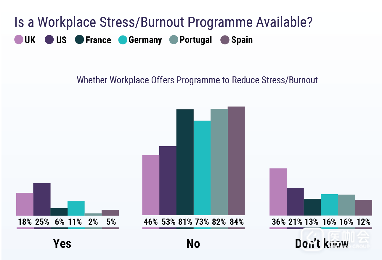 调查显示,大部分医院不会提供减轻压力/职业倦怠的项目,然而,无法了解这部分医院的数量。美国和英国医生最有可能获得关于减轻压力/职业倦怠的项目,然而,英国医生不太可能知道这个项目是否存在。