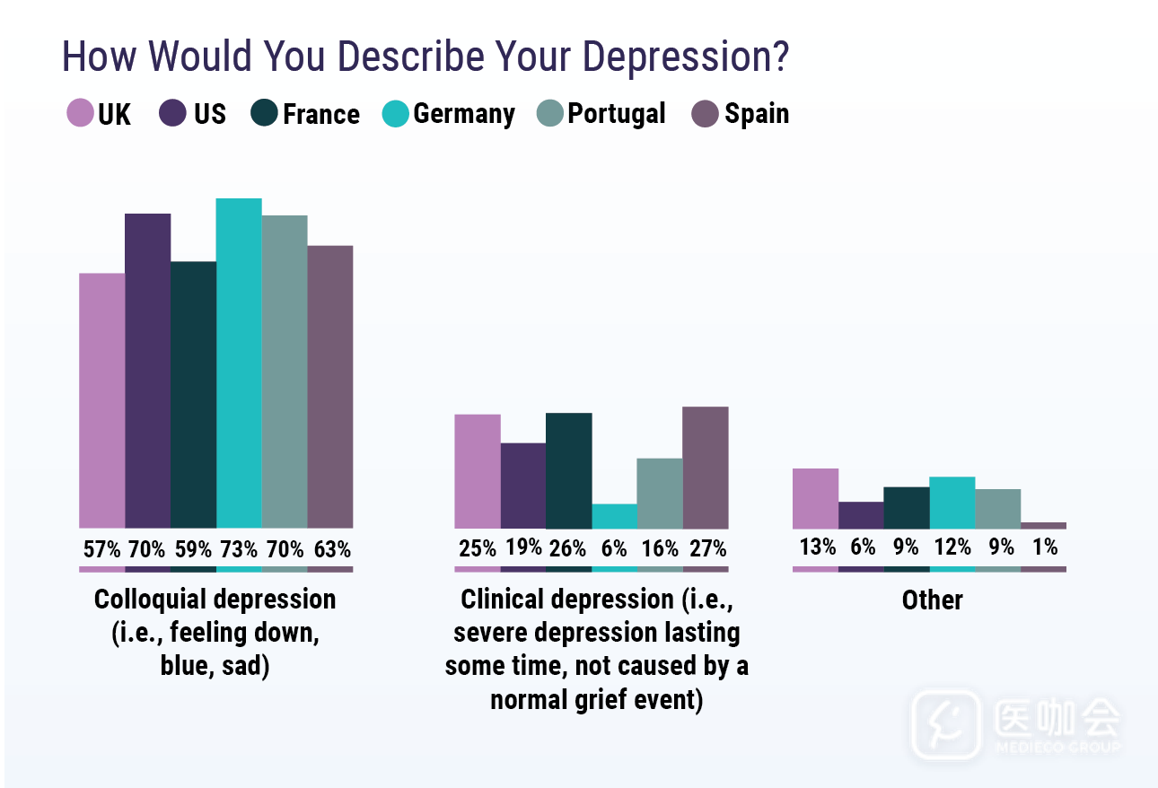 调查显示,57%—73%医生的抑郁为一般意义上的抑郁情绪,即表现为情绪消沉、忧郁或者悲伤,这类抑郁人群在德国、葡萄牙和美国占比最高,英国占比最低;临床抑郁,即表现为持续一段时间的严重抑郁症状,这种情况不是由于不幸事件的打击造成的,法国、西班牙和英国医生占比最高,德国医生占比最低。