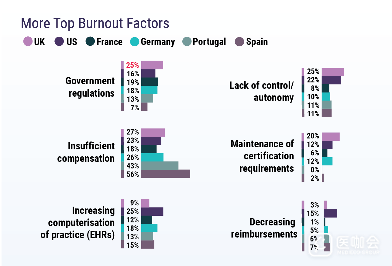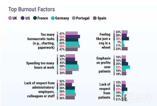 Medscape调查了导致医生职业倦怠的因素。一些医生的回答可以让我们深入了解每个国家不同的医疗体系。总之,文书等行政工作因素是所有国家中困扰医生最大的问题,其中葡萄牙和美国医生占比最高,西班牙和英国医生占比最小;其次是工作时间长,太长的工作时间对葡萄牙、德国和法国医生影响最大,对西班牙医生影响最小;