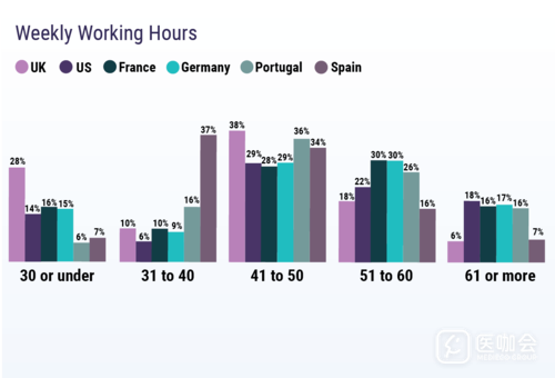 德国、法国和葡萄牙的医生每周普遍工作超过40个小时,英国兼职医生最多,超过四分之一的英国医生每周工作时间不超过30小时。