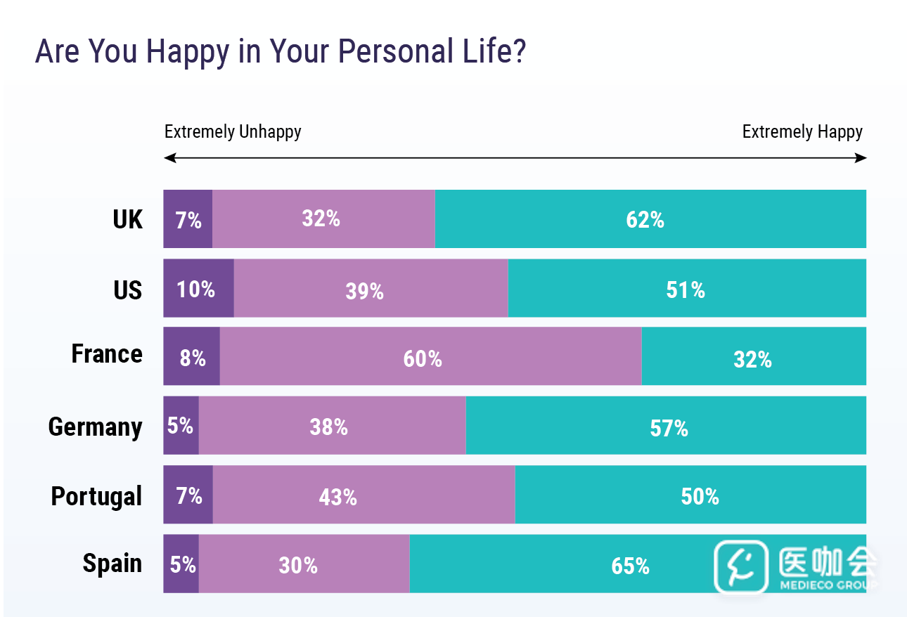 调查显示,在所有国家中,50%—60%的医生对自己工作之外的私人生活感到非常甚至是特别幸福,然而,法国医生是个例外,仅有三分之一的法国医生感到非常幸福,法国医生的回答大多处于特别幸福和特别不幸福之间的中间位置。