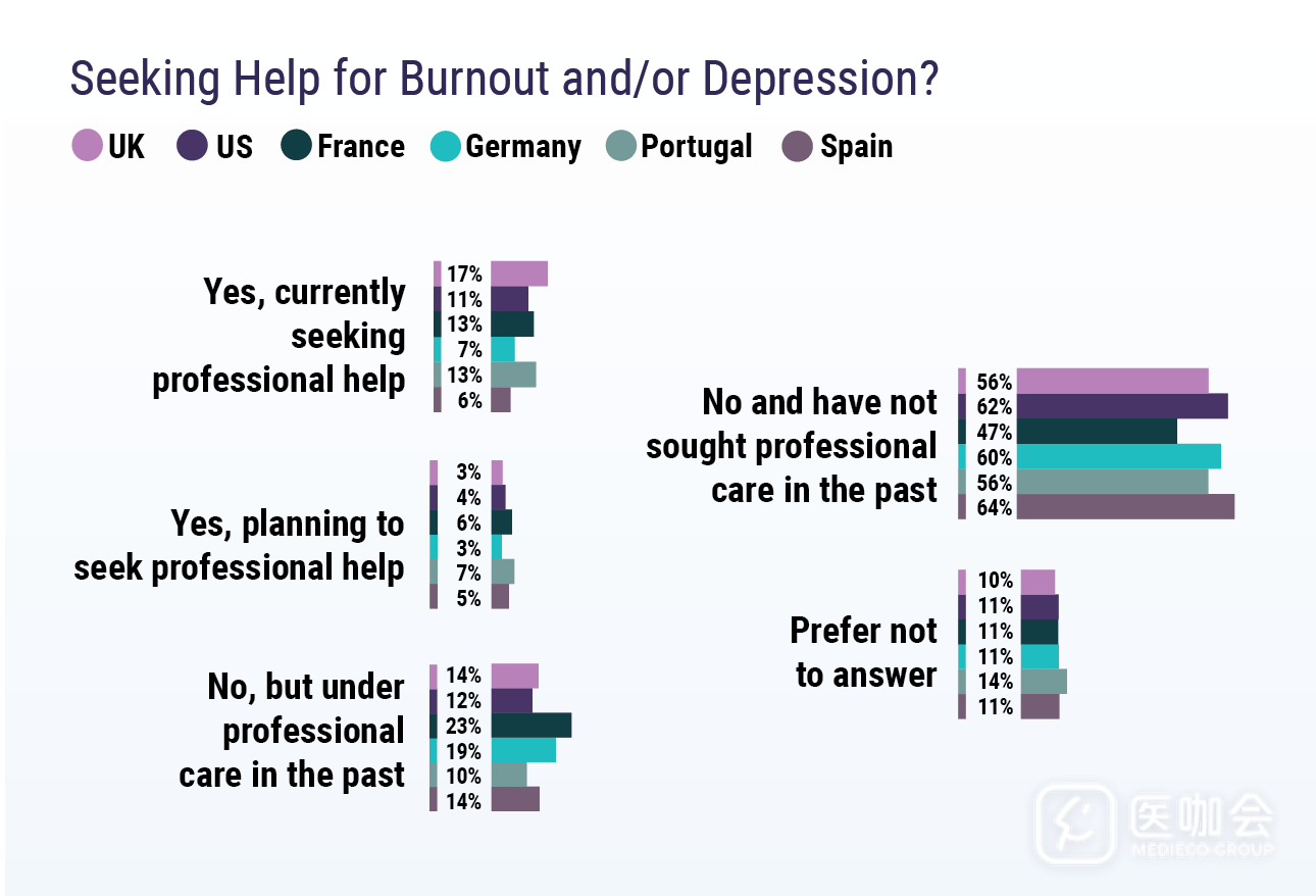 受到职业倦怠或抑郁问题困扰的医生很少去寻求专业性帮助。目前正在寻求专业性帮助的医生群体中,英国医生占比最大,西班牙医生占比最小。在计划去寻求专业性帮助的医生群体中,葡萄牙医生占比最大,德国和英国医生占比最小。在曾经寻求过专业性帮助的医生群体中,法国医生占比最大,葡萄牙医生占比最小。