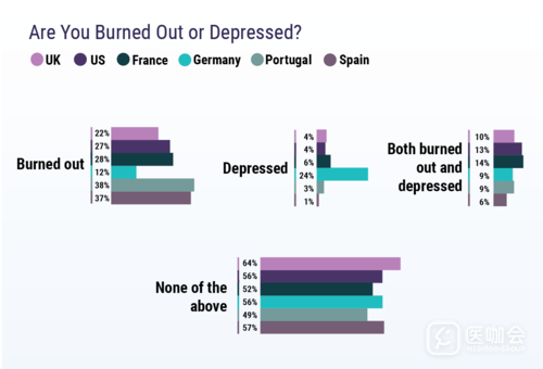 医生的职业倦怠和抑郁问题很普遍。调查结果显示,在所有国家中,36%—51%的医生存在职业倦怠和抑郁状况。西班牙和葡萄牙医生的职业倦怠问题最普遍;德国医生抑郁情况最多(24%),其次是法国(6%),相差甚远。然而,德国医生的职业倦怠情况在所有国家中是最少的。既不抑郁也无职业倦怠的类别,在英国医生的占比在所调查国家中最高。