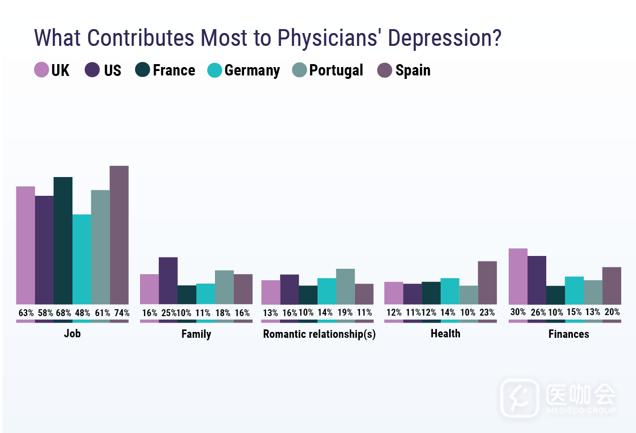 调查显示,在所有国家中,导致抑郁的最大因素是工作,西班牙医生占比最大,德国医生占比最小。对于收入的担心是导致医生抑郁的又一个因素,英国医生占比最高,其次是美国医生,占比最少的是法国医生。家庭因素对美国医生影响最大,对法国医生的影响最小。对自己健康的关注也是导致医生抑郁的因素,西班牙医生占比最高,葡萄牙医生占比最低。