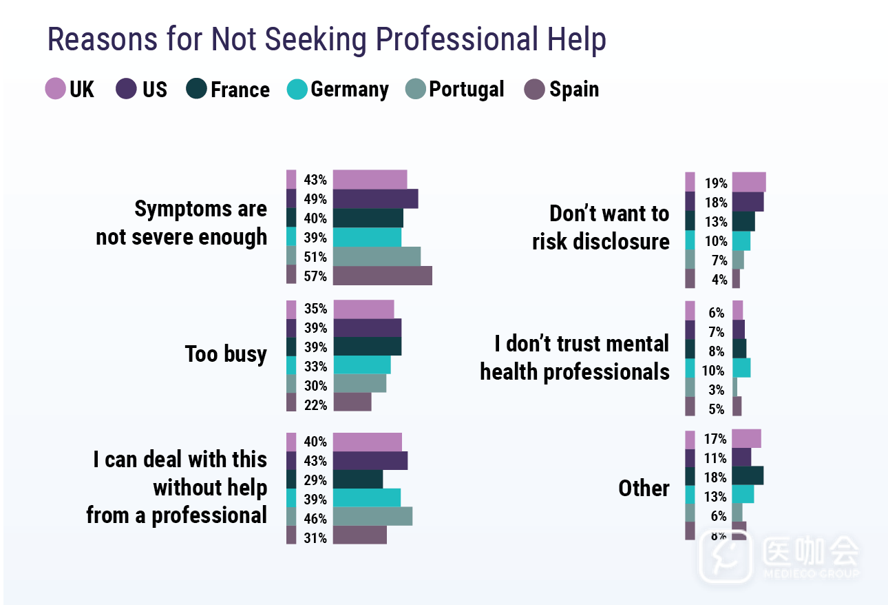 对专业的心理健康咨询的不信任也是一个重要的原因,在该原因中,德国医生占比最高,葡萄牙医生占比最低。
