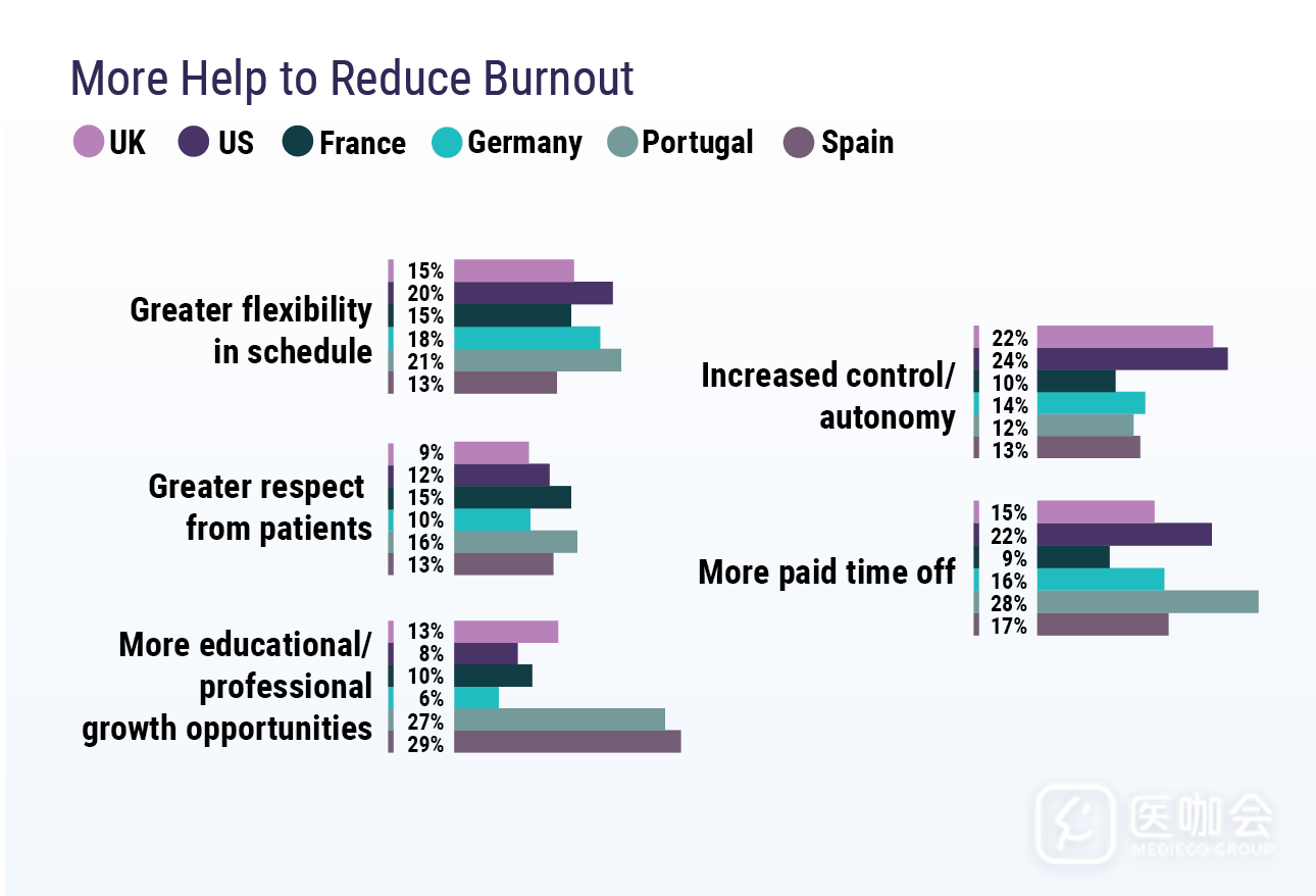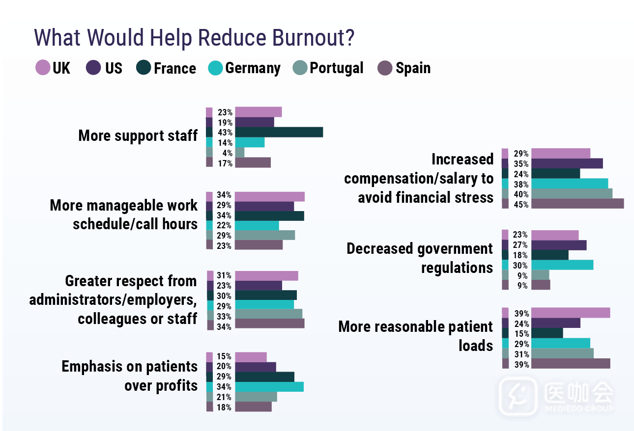 当提到帮助减轻职业倦怠的办法,许多医生的答案与先前调查中提到的减轻职业倦怠的办法是一致的。法国医生最倾向于获得同事的帮助,葡萄牙医生并不青睐这种办法;更好的工作时间和工作事务的安排最受法国和英国医生欢迎,德国医生并不青睐这种办法;得到更多来自同辈和管理者的尊重是西班牙医生的最大愿望,但美国医生不是这样的想法;