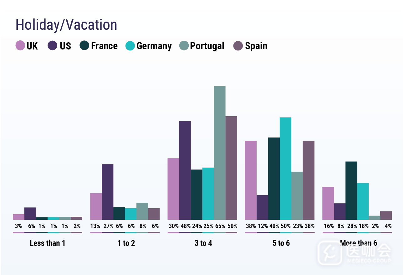 整体来讲,大部分医生每年可至少享有3周的年假。法国和德国医生年假最长,为5周或者更多,葡萄牙和美国医生的年假最短,美国医生一年仅仅享有一周年假,而法国医生的年假却超过6周。
