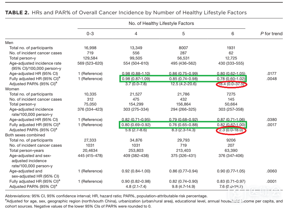 研究人员还使用人群归因危险度百分比(PAR%)来估计当前研究人群中假定的癌症减少情况。敏感性分析仅限于≥45岁的参与者或以健康生活方式≤1个的参与者作为参照组。