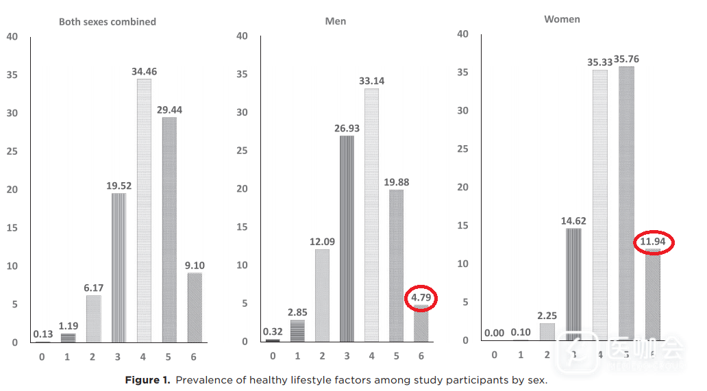 大多数参与者有3~5种健康生活方式,而只有4.79%的男性和11.94%的女性拥有全部6种健康生活方式(如图1所示)。