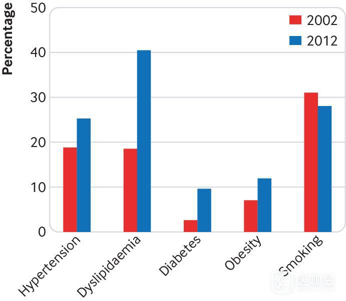 中国卒中主要危险因素的患病率持续很高,其中大部分危险因素的患病率在2002年至2012年间有所增加(图3)。