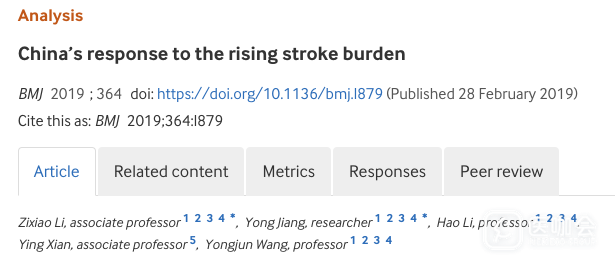 2019年2月28日,著名期刊BMJ刊登了一篇关于中国卒中的文章,通讯作者为天坛医院王拥军教授。文章讨论了中国卒中患病人数不断增长的原因,以及中国为降低卒中发生和改善卒中诊疗水平而采取的措施。