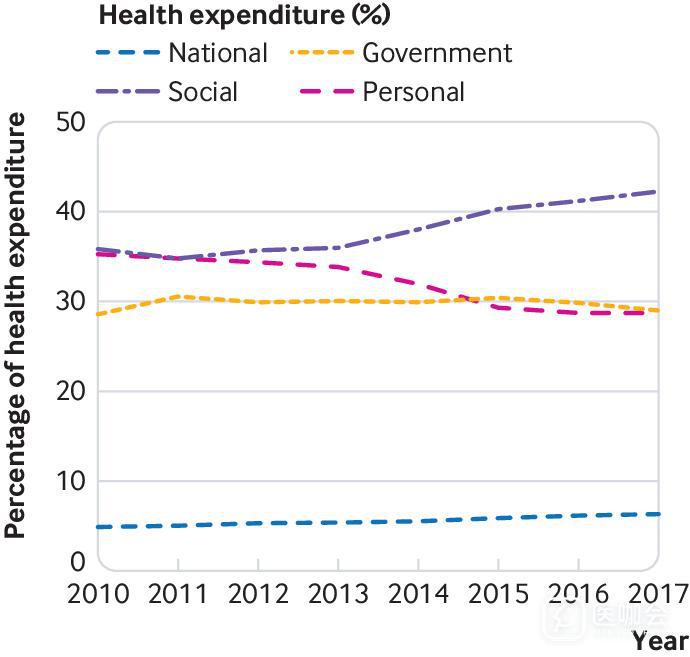 过去30年,中国经济实现了前所未有的增长,医疗卫生和公共卫生支出也快速增长。医疗成本的增长已经超过了经济的增长,自付医疗费用逐渐减少(图2)。自2007年以来,中国实施了全面的医疗改革。医疗保险覆盖范围从2006年的45%增加到2017年的95%以上。扩大医保覆盖范围可以提高卒中的检出率,提高患者获得卒中治疗的机会,因此也增加了卒中诊疗的成本。