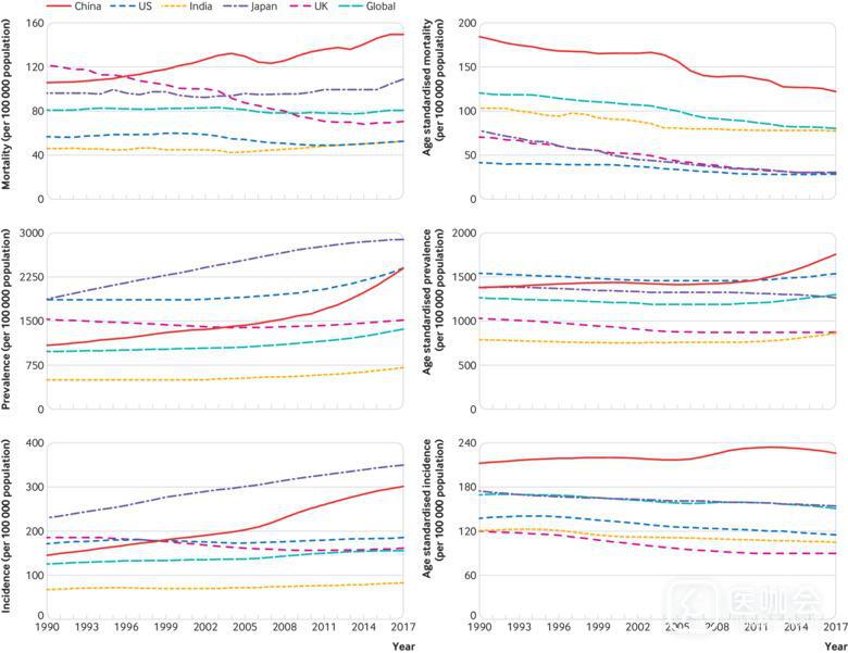 中国的卒中粗死亡率一直在急剧上升,在过去30年的增长速度超过了其他国家。此外,卒中的患病率和发病率比其他国家上升得更快(图1)。作为世界上人口最多且老龄化速度很快的国家,中国在降低卒中发病率和死亡率方面面临着越来越大的挑战。