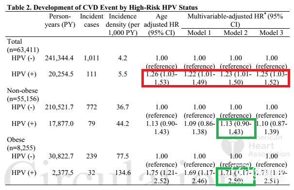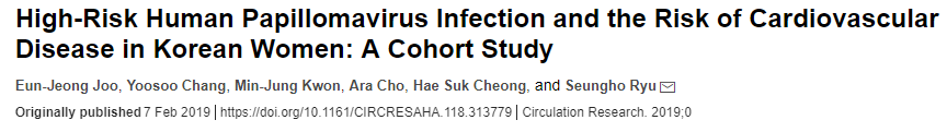 Joo EJ, Chang Y, Kwon MJ, et al. High-Risk Human Papillomavirus Infection and the Risk of Cardiovascular Diseasein Korean Women: A Cohort Study. Circ Res. 2019 Feb 7.