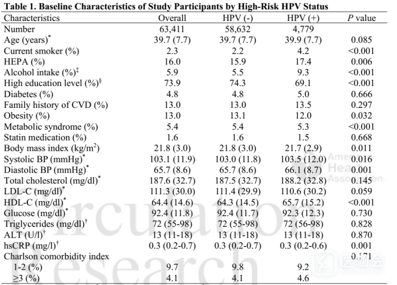 为填补上述空白,这项近期发表在《Circulation Research》的研究,考察了HPV感染对CVD事件发生的纵向影响。这项大规模队列研究的数据来自于韩国女性,她们在基线期没有心血管疾病,并接受了由临床医生采集的样本(作为健康筛查的一部分)进行的高危HPV检测。