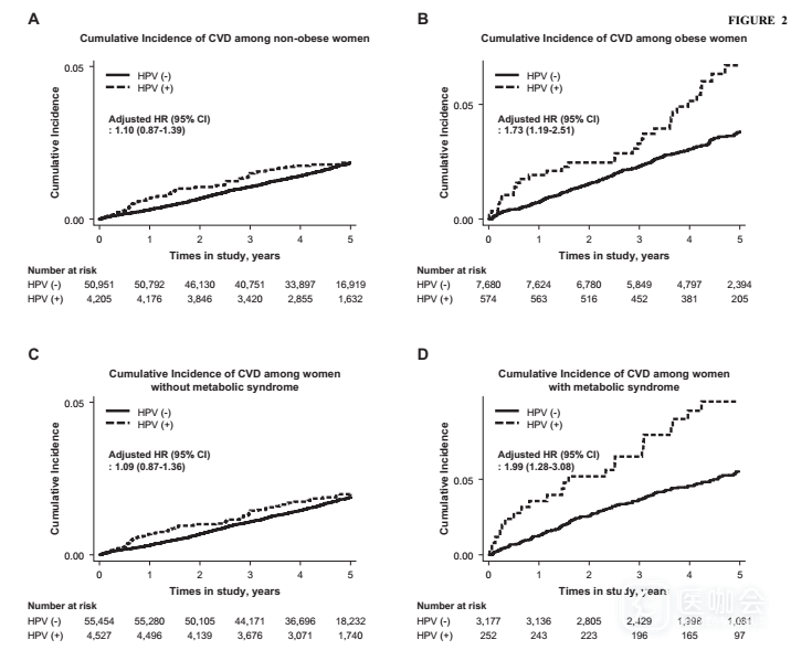图2:高危HPV阳性者的心血管疾病累积发病率(根据是否肥胖和是否有代谢综合征分列)