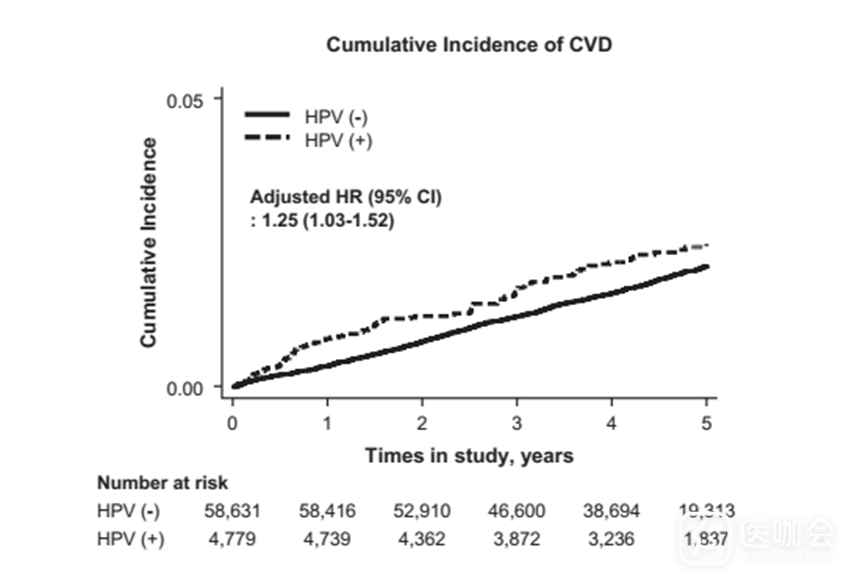 进一步调整BMI、筛查年、吸烟状况、饮酒情况、定期锻炼、教育程度、CVD家族史和查尔森合并症指数(指除基础疾病以外的其他器官或组织的损伤及异常,英文简称为CCI)后,结果显示,与高危HPV阴性者相比,高危HPV阳性者发生心血管事件的HR为1.22(1.01-1.49)。