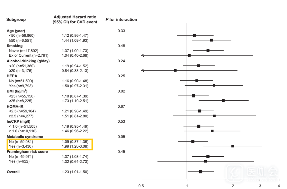 在没有代谢综合征的人群中,与高危HPV阴性者相比,高危HPV阳性者发生心血管事件的调整后HR为1.09(0.87-1.36),而在代谢综合征人群中,相应的HR为1.99(1.28-3.08)。
