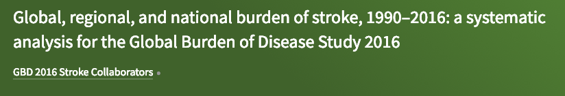 2019年3月11日,《Lancet Neurology》杂志发布了2016全球疾病负担研究( Global Burden of Disease Study, GBD)关于卒中的分析数据,结果显示,从1990年到2016年,卒中的年龄标化死亡率大幅下降,但年龄标化发病率的下降幅度较小,卒中的疾病负担仍然很高。下面让我们一起来看看具体研究结果。
