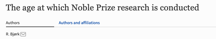 对比一下Jones 和 Weinberg 的研究结果(2011),显示诺贝尔获奖者进行那些重磅研究时的平均年龄为39.0 ± 8.54岁,物理学为37.2 ± 9.20岁,化学为40.2 ± 8.24岁,医学为39.9 ± 7.86岁。以上年龄都比Manniche和Falk(1957)针对1901-1950年间分析得出的年龄要大,这说明如今诺贝尔奖得主在进行那些重磅研究时的年龄更大了。