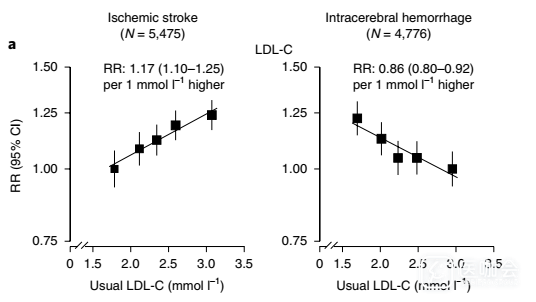 在整个检查范围内(1.7~3.2 mmol /l),LDL-C每升高1 mmol/l,IS的风险升高17%(RR=1.17,95% CI:1.10~1.25),ICH的风险降低14%(RR=0.86,95% CI:0.80~0.92);